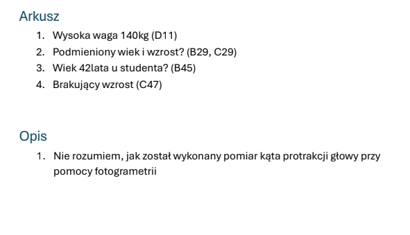 Po otrzymaniu od Was materiałów przejrzę arkusz pod kątem brakujących wartości (np. brak wzrostu u osoby nr 3) oraz podejrzanie wysokich lub niskich wyników (np. waga 652 kg albo 6,52 kg — być może miało być 65,2 kg, ale ktoś pominął przecinek lub wstawił go w złym miejscu). Dodatkowo sprawdzę opis badania, który mi przekażecie, i upewnię się, że wszystko jest dla mnie jasne.